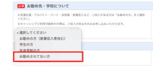また、大きな特徴として家事手伝いや結婚しておらず収入のない方でも楽天カードに申し込むことができるようになっています。申込画面にも「お勤めされていない方」という選択肢が用意されています。